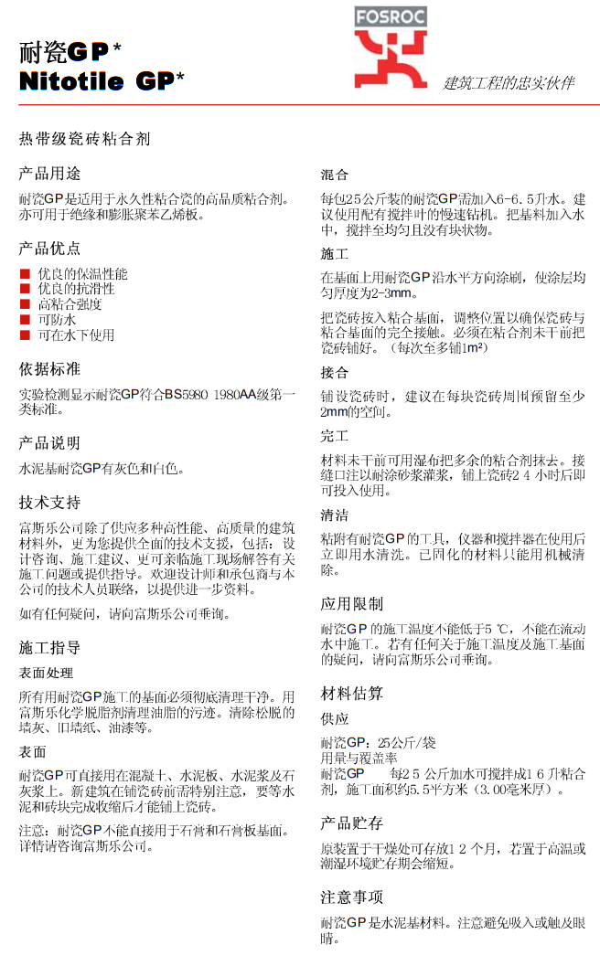 耐瓷Nitotile GP熱帶級(jí)瓷磚粘合劑