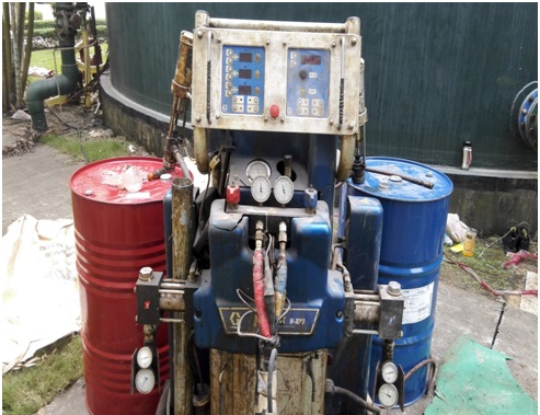 噴涂德國(guó)巴斯夫聚脲Elastocoat CC 5033面涂,采用了美國(guó)固瑞克專用聚脲噴涂機(jī)H-XP3。