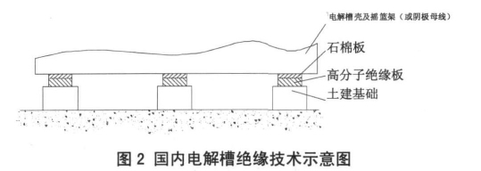 (1) 國內(nèi)電解鋁技術(shù)的通常做法:基本上都是采取在土建基礎(chǔ)上安裝高分子絕緣板和石棉板各一層,如圖 2 所示。
